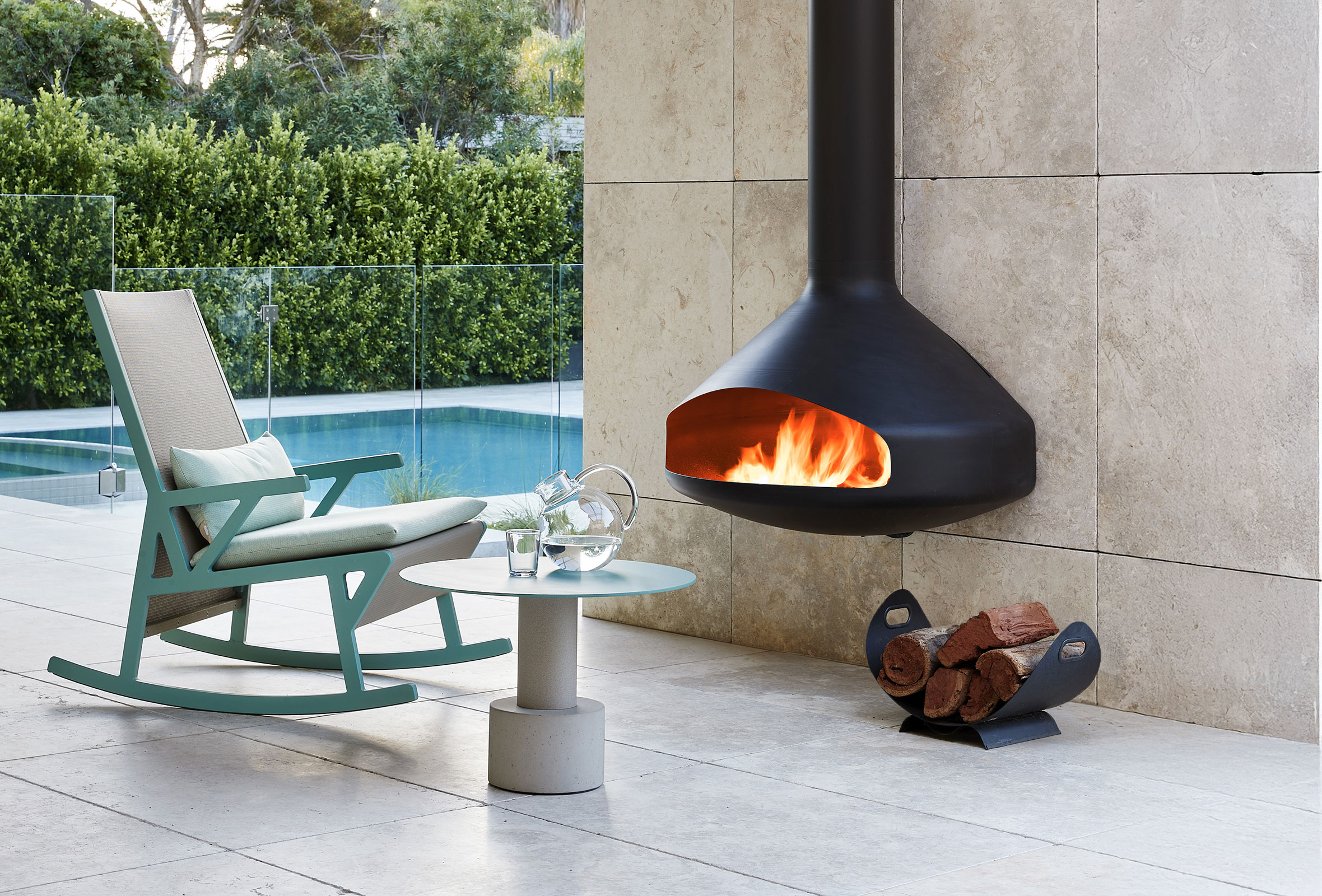 En finition noire ou rouillée, le Paxfocus outdoor peut se situer dans un salon contemporain ouvert à la brise ou sous un auvent champêtre et rural